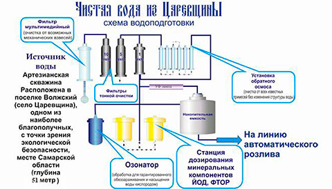 Наша вода берется из артезианской скважины, глубиной 51 метр, и подвергается минимальной доочистке. Мы используем двухступенчатую механическую фильтрацию, ультрафиолетовую обработку, обратный осмос, озоновую обработку и тонкий фильтр механической очистки. В результате этих процессов мы получаем воду, которая отличается чистотой, прозрачностью и свежестью.